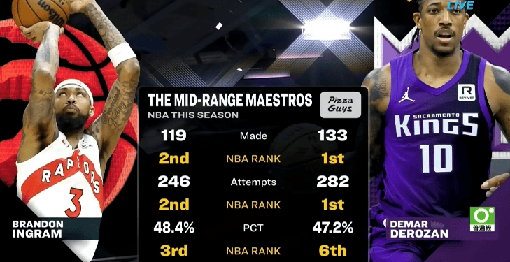 中投王!中距离出手&命中数:德罗赞皆第一,英格拉姆皆第二