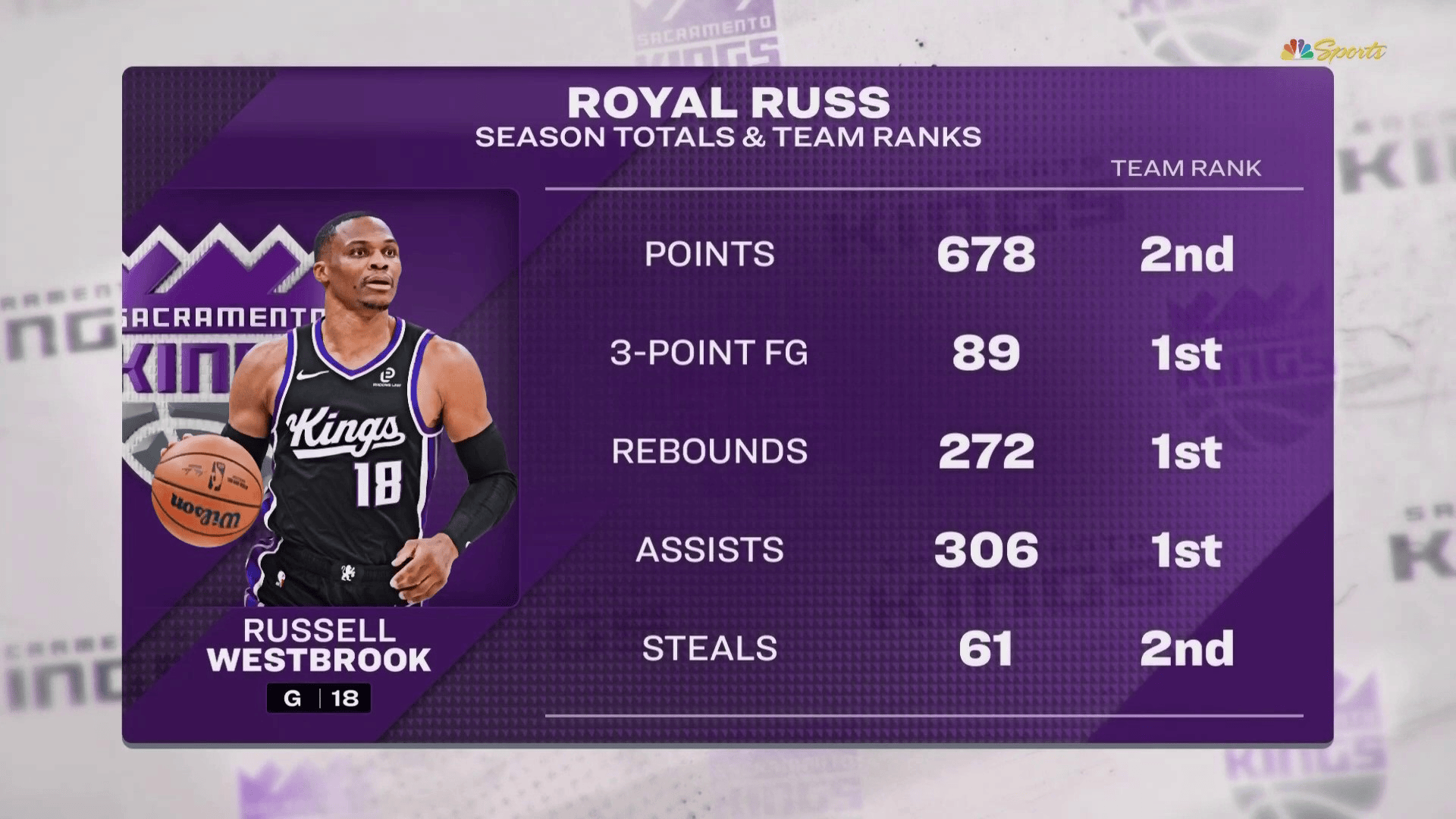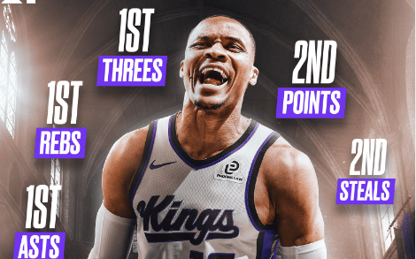 威少本赛季国王队内:三分、篮板、助攻三项第一,得分第二