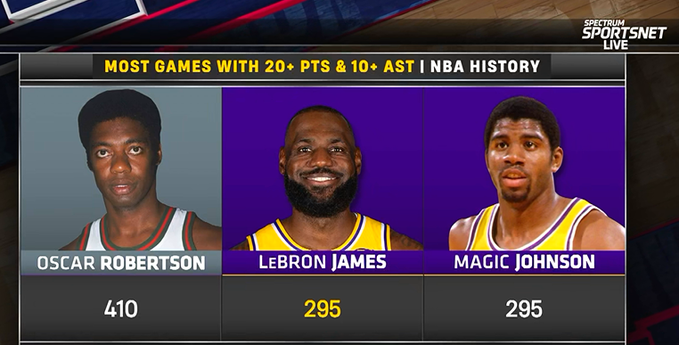 历史单场至少20+10助次数榜:大O410次、詹姆斯&魔术师295次