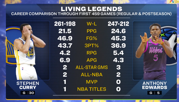 库里华子生涯前459场数据对比:21.5+4.2+6.9/24.6+5.4+4.3