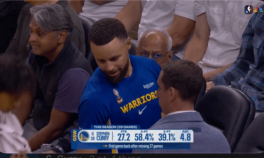 库里从替补席走向技术台,全场观众爆发雷鸣般的呼声