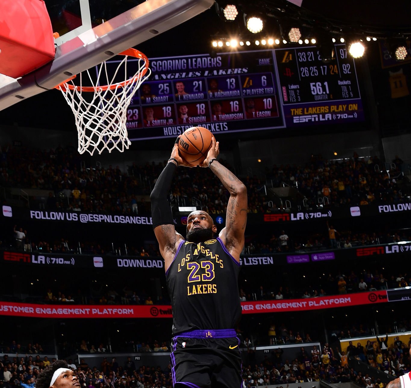 詹姆斯抢断杜兰特反击顶着杜兰特上篮打进,拿到湖人首分