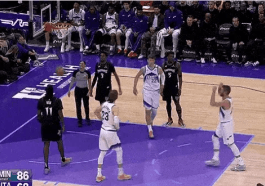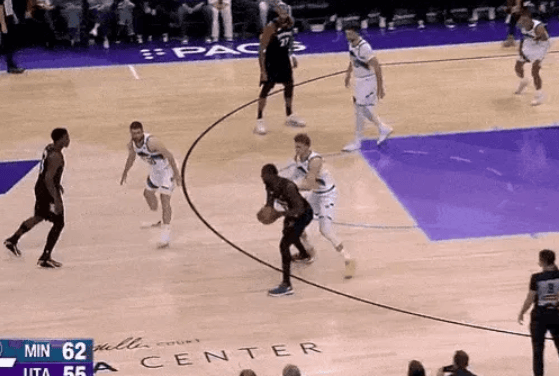 爱德华兹接兰德尔手递手传球,顺势杀入篮下强硬上篮命中