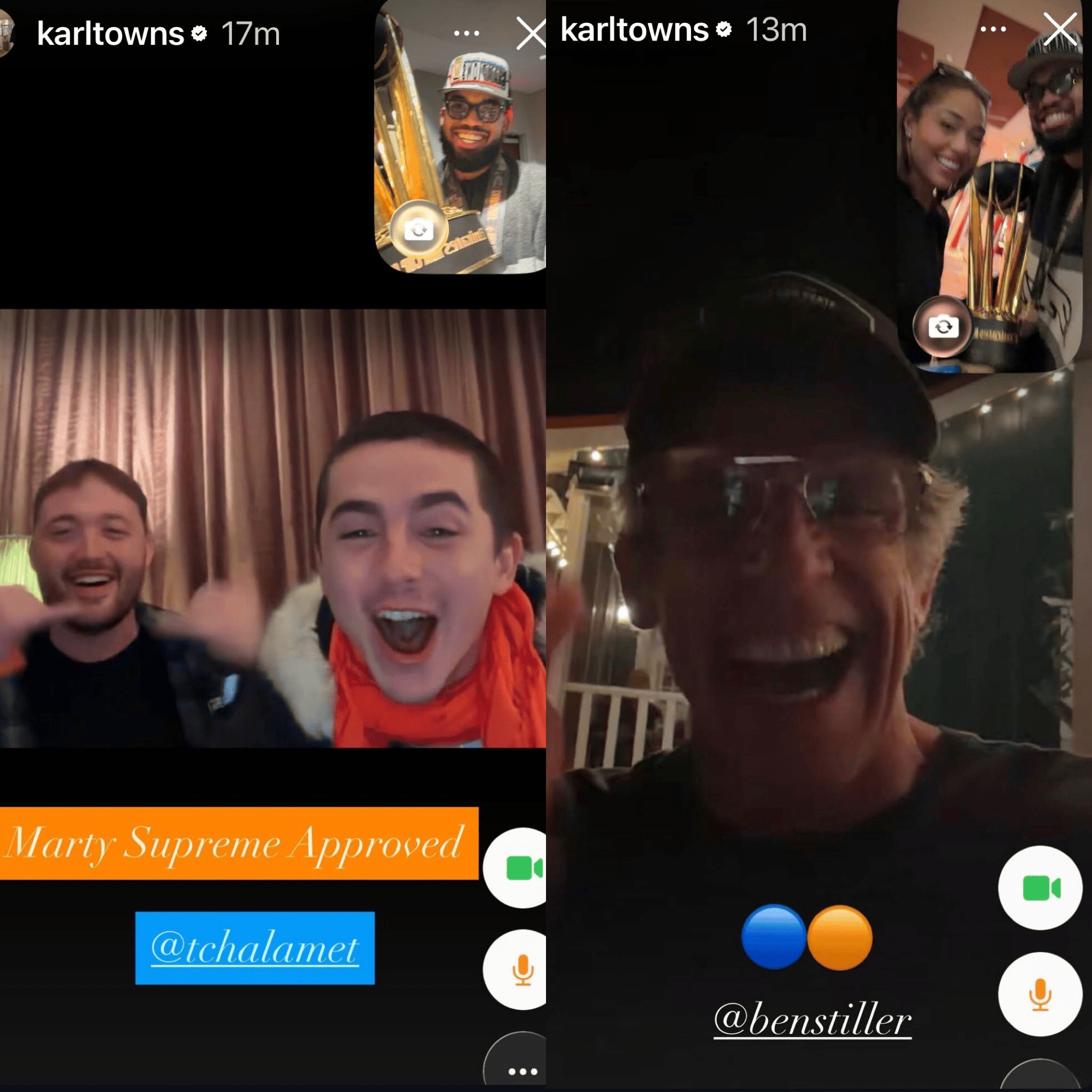 唐斯INS晒照:和知名演员“甜茶”、本-斯蒂勒视频庆祝夺冠