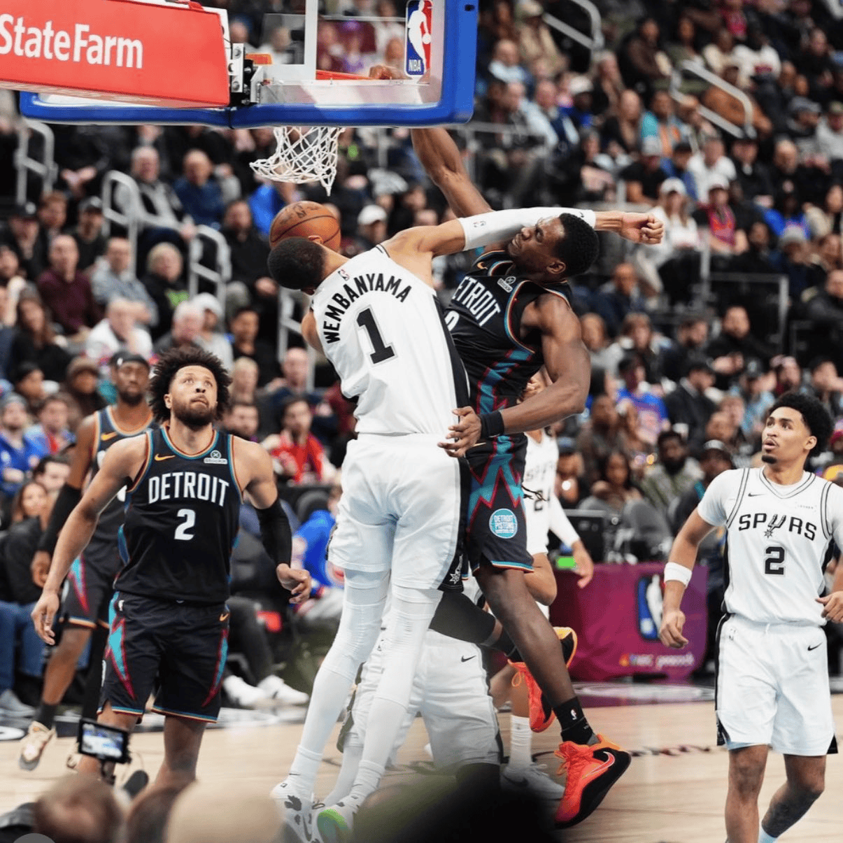 强硬!杜伦左手战斧隔扣文班打成2+1,活塞追至落后马刺10分
