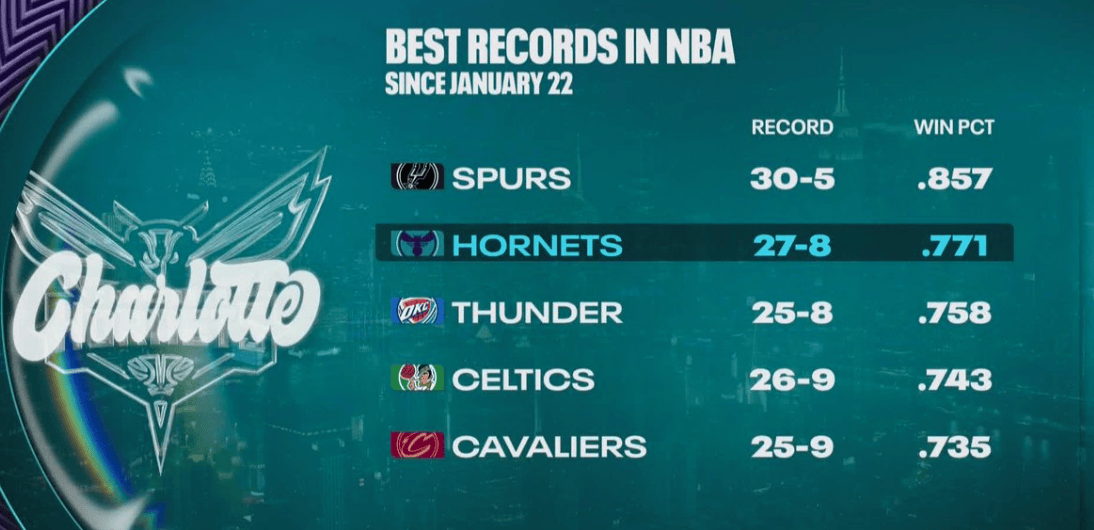 1月23日至今战绩:马刺30胜5负第一,黄蜂27胜8负第二
