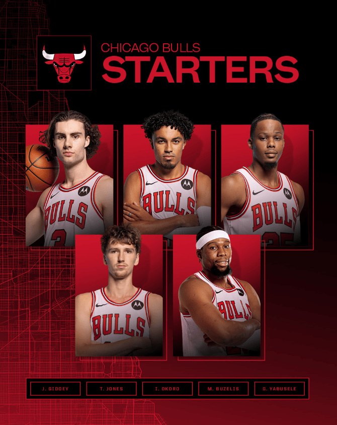公牛首发:吉迪、琼斯、奥科罗、布泽利斯、亚布塞莱。