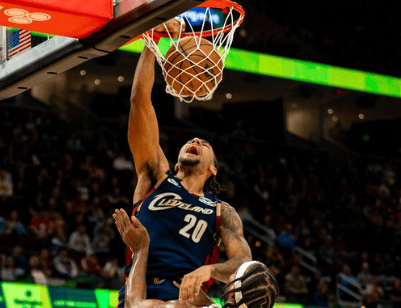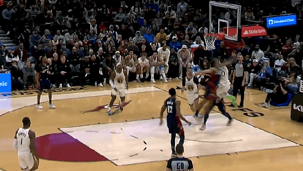 桑托斯追身大帽波特上篮,随后三分再中领先14分打停骑士