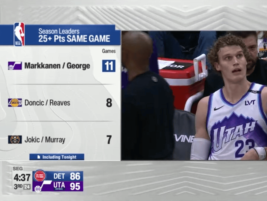 马尔卡宁和乔治本赛季第11次同砍25+,联盟最多的双人组