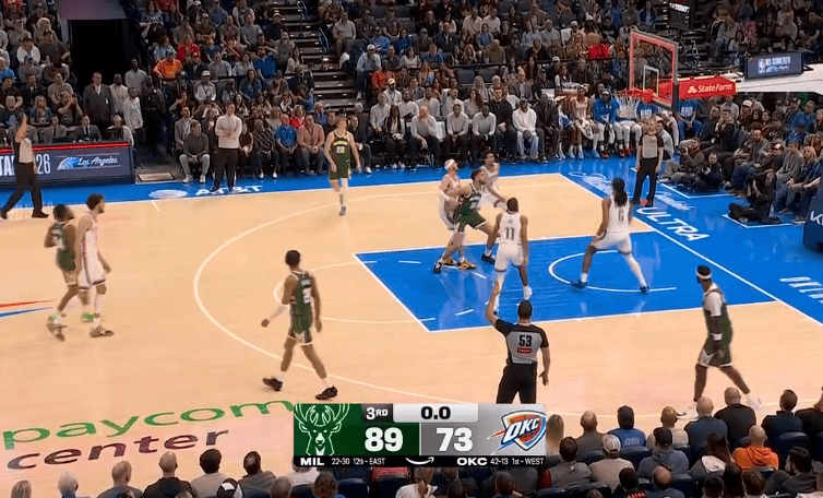 托马斯弧顶强投三分不中,雷霆三节以73-89落后雄鹿