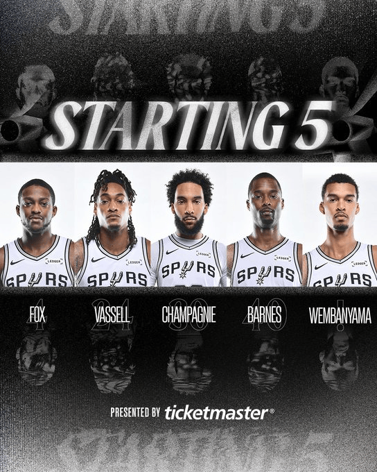 马刺首发:福克斯、尚帕尼、瓦塞尔、巴恩斯、文班亚马