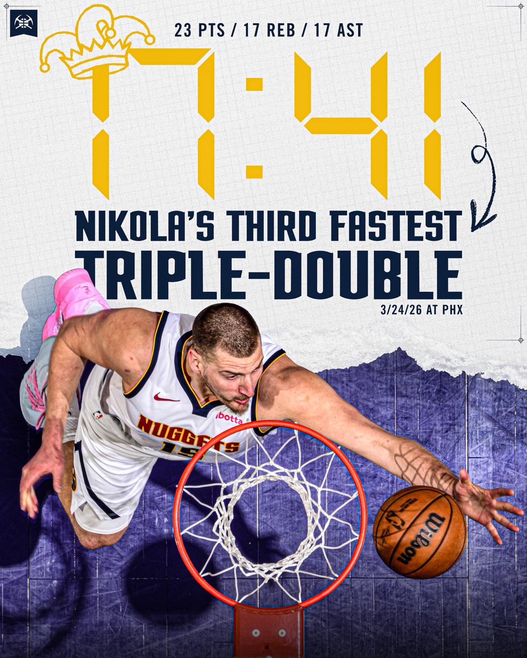 掘金官方:约基奇17分41秒砍下三双,再现历史级高效表现