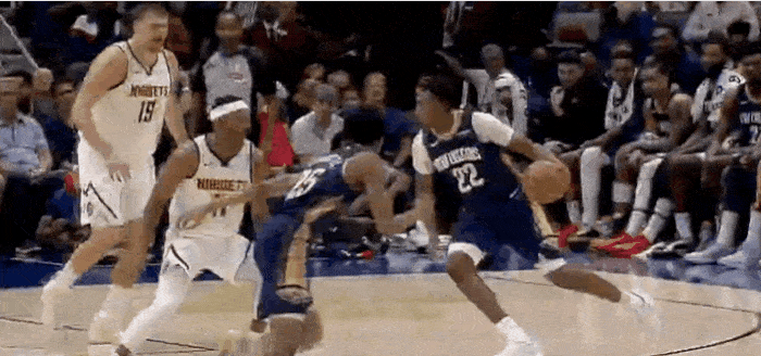 奎因一步过掉约基奇贴身防守,上演精彩双手暴扣