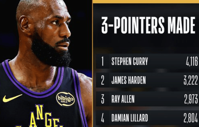 詹姆斯生涯已命中2561记三分球,超越雷吉-米勒独占历史第六