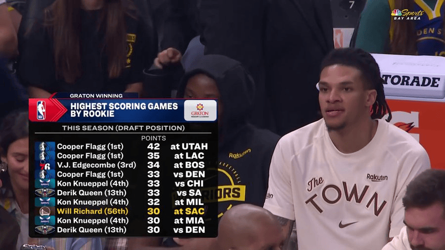 赛季至今新秀单场最高分:弗拉格42分第一,理查德30分上榜