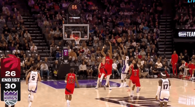 蒙克LOGO超远三分压哨投进,国王首节30-26领先猛龙
