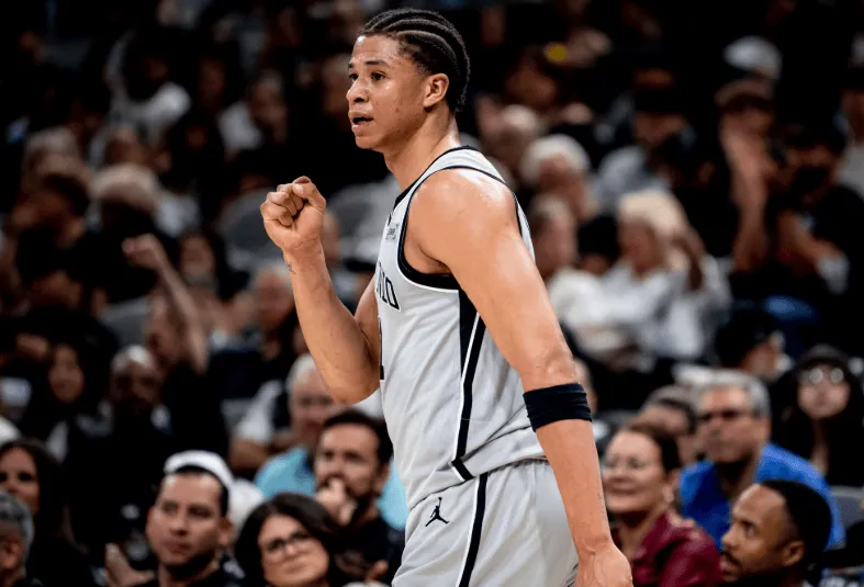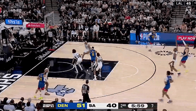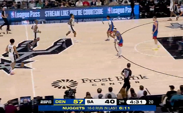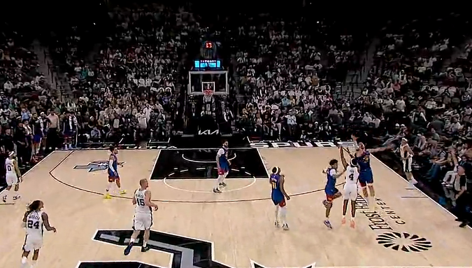福克斯中场LOGO超远三分压哨投进,马刺上半场56-70落后掘金