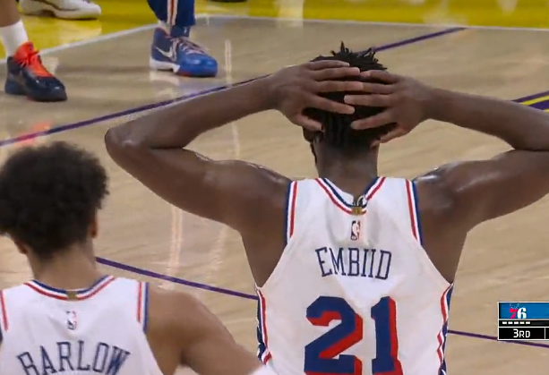 恩比德跳投命中打成2+1,目前11中8砍下23分6篮板6助攻