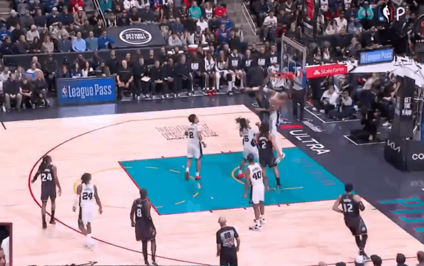 强硬!杜伦左手战斧隔扣文班打成2+1,活塞追至落后马刺10分