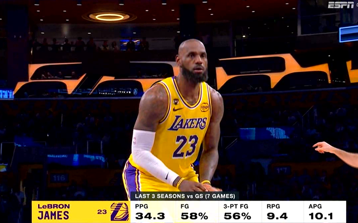 詹姆斯近7场对阵勇士场均34.3分9.4板10.1助,命中率58/56%