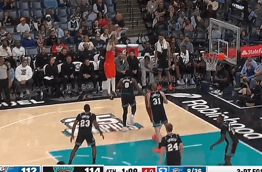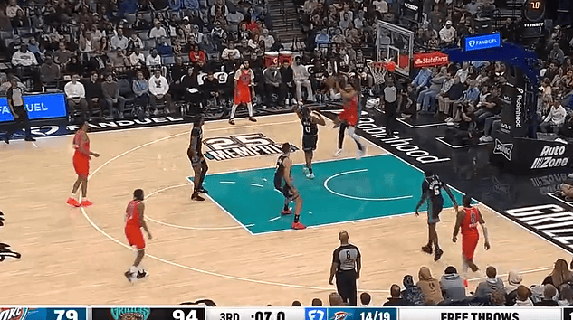 米切尔失去平衡下后仰抛投命中,三节战罢雷霆落后灰熊13分