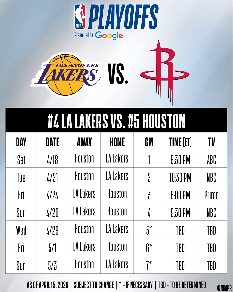 湖人vs火箭首轮赛程:首战19日早8点半,次战22日早10点半