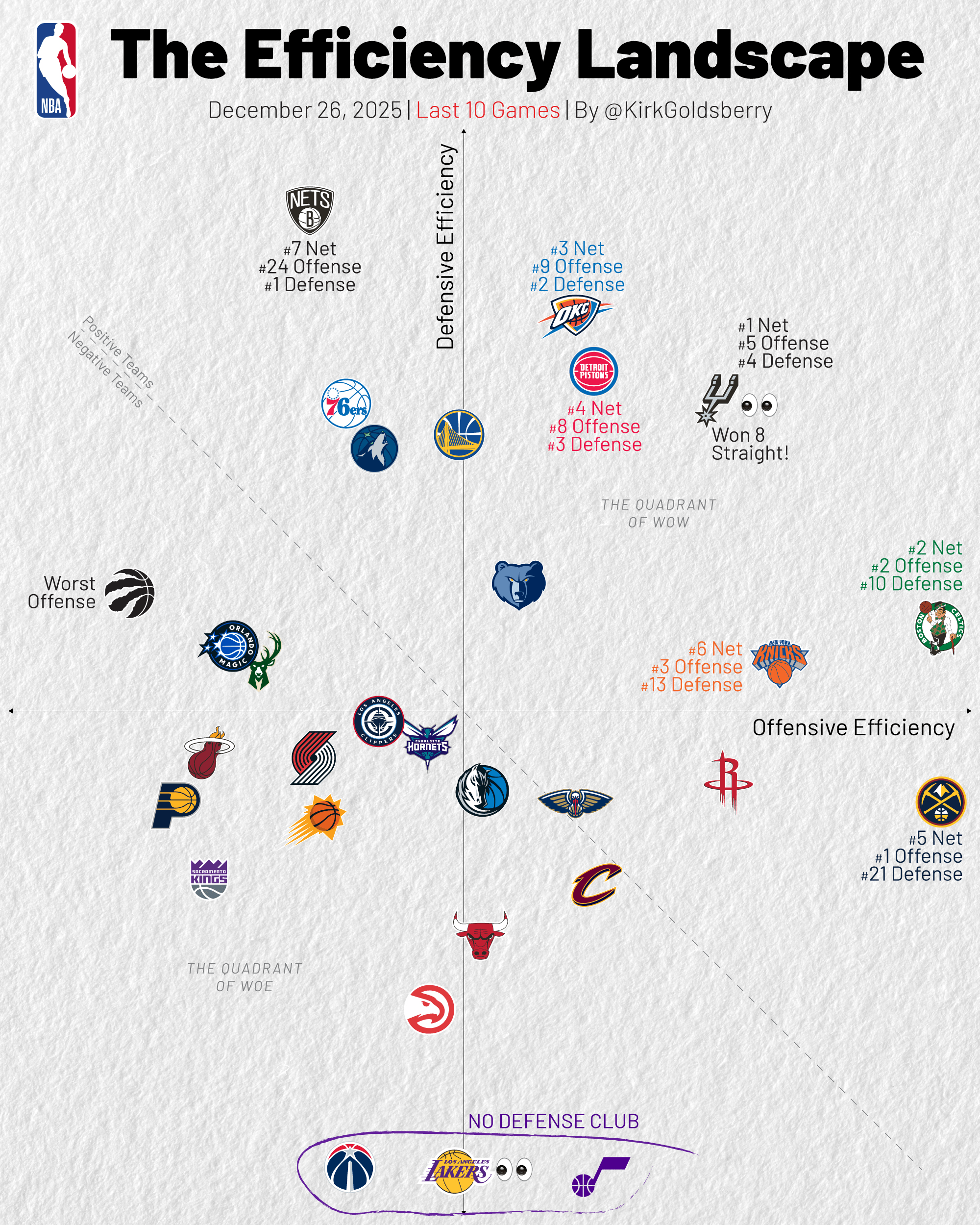 近10场攻防:马刺净效率第一、掘金进攻第一、湖人防守垫底