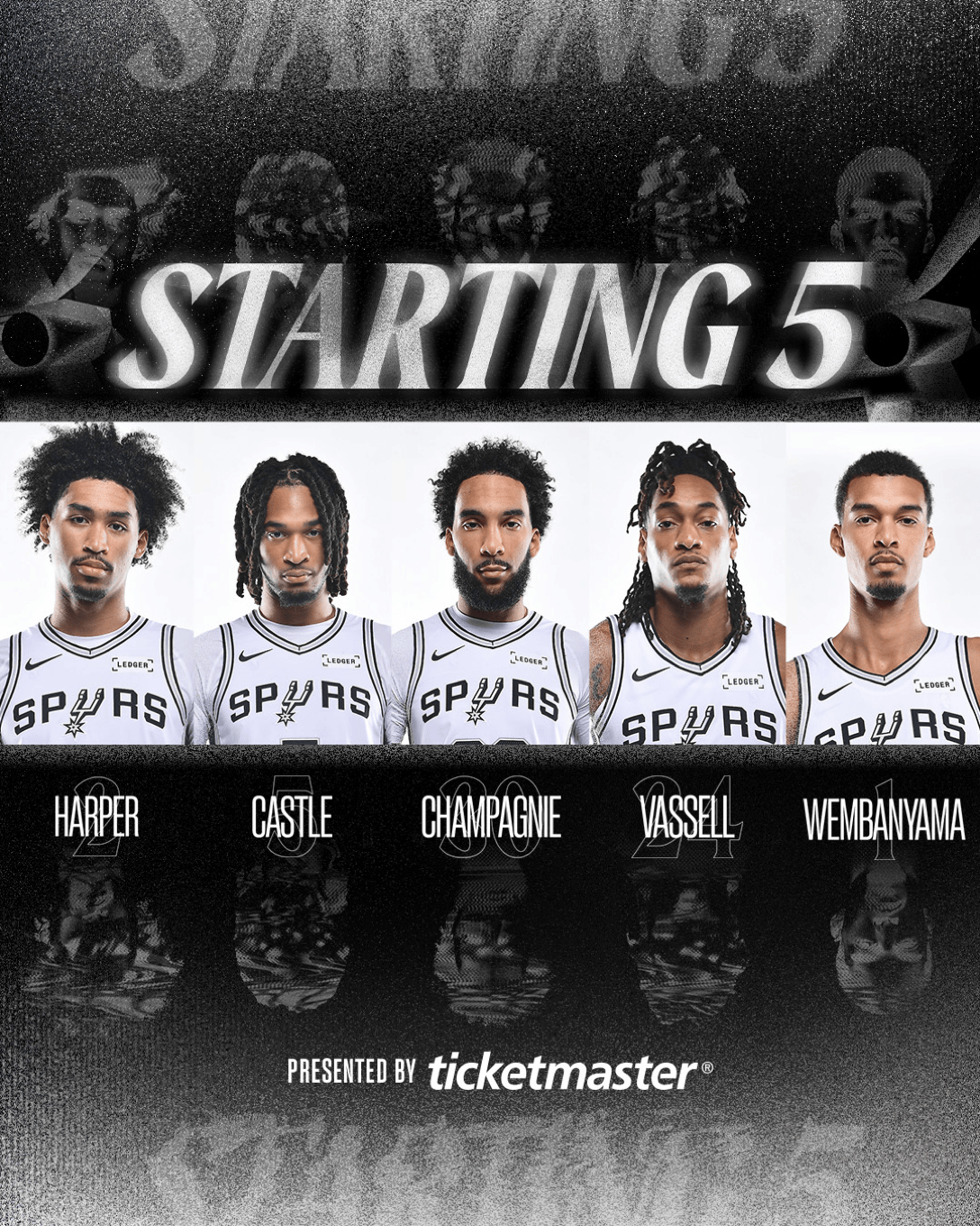 马刺首发:哈珀、卡斯尔、尚帕尼、瓦塞尔、文班亚马