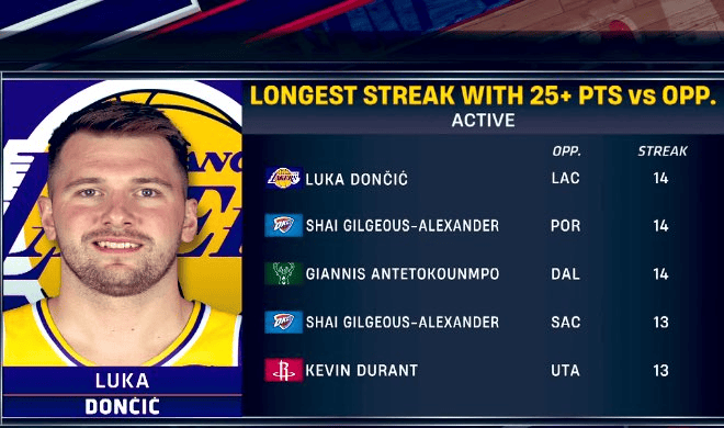 东契奇面对快船连续14场拿到25+,和SGA、字母并列现役第一