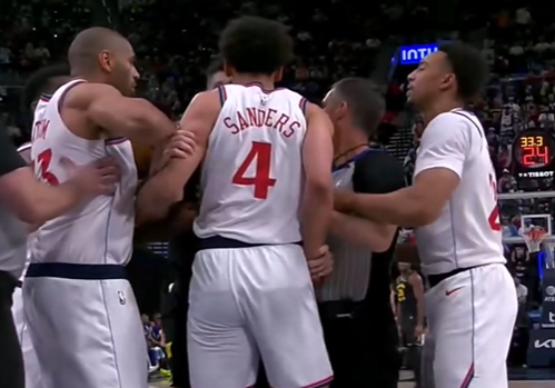 科比-桑德斯和斯潘塞抢篮板时缠在一起,事态险些升级