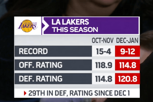 湖人自12月1日以来攻防效率均有下滑,防守效率排联盟第29位