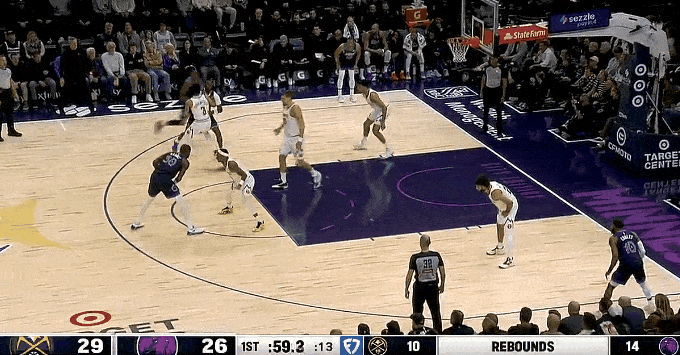 兰德尔轻松突破换手上篮打进,森林狼打出12-1仅落后掘金1分