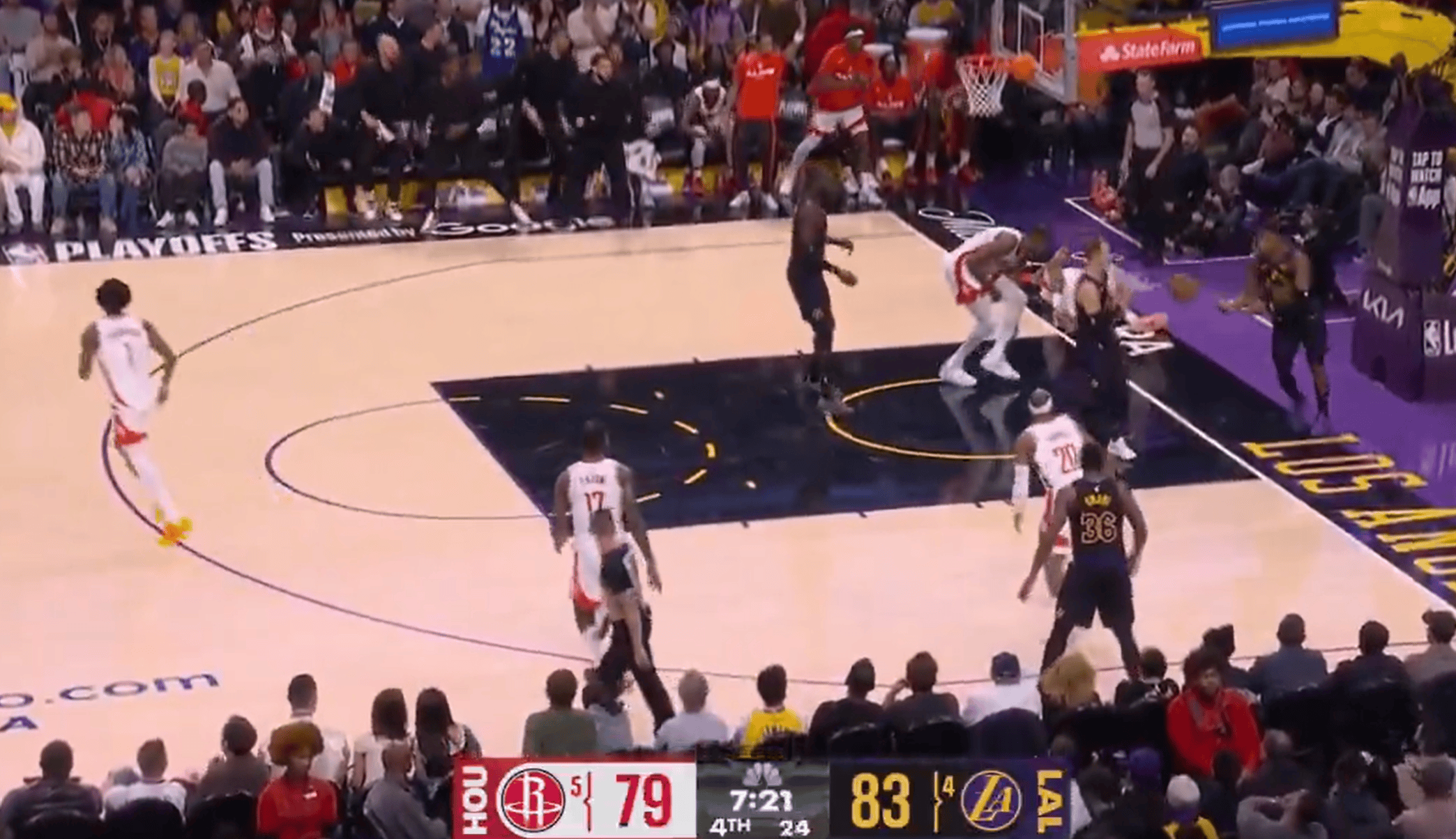 詹姆斯人群抢板直接快攻反击,斯马特补篮点进领先火箭7分