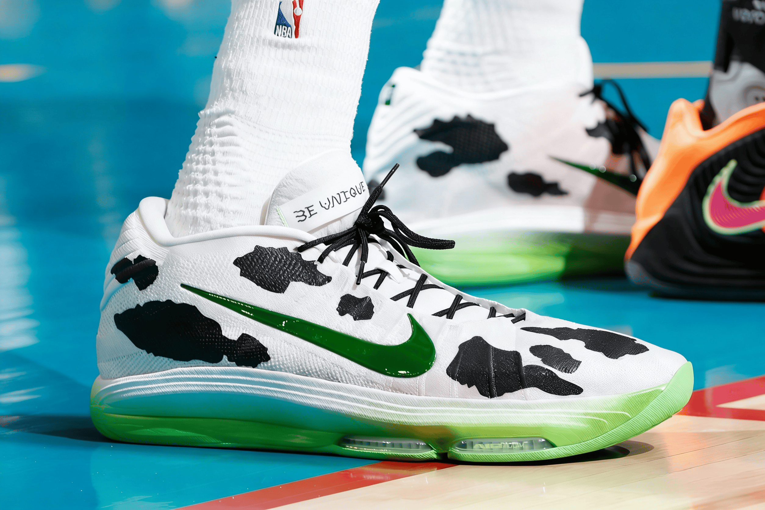 文班亚马穿着奶牛配色Hustle3,得到21分17篮板4助攻6盖帽