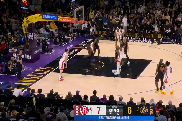 哈登迎着两人包夹压哨三分命中,目前7中6得到全场最高16分