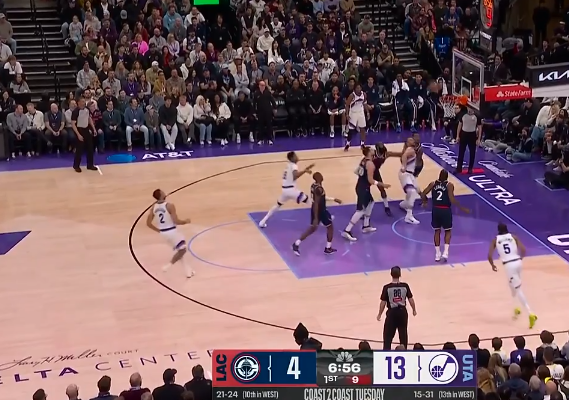 球进灯亮!埃斯-贝利压哨三分投进,爵士半场54-53领先快船
