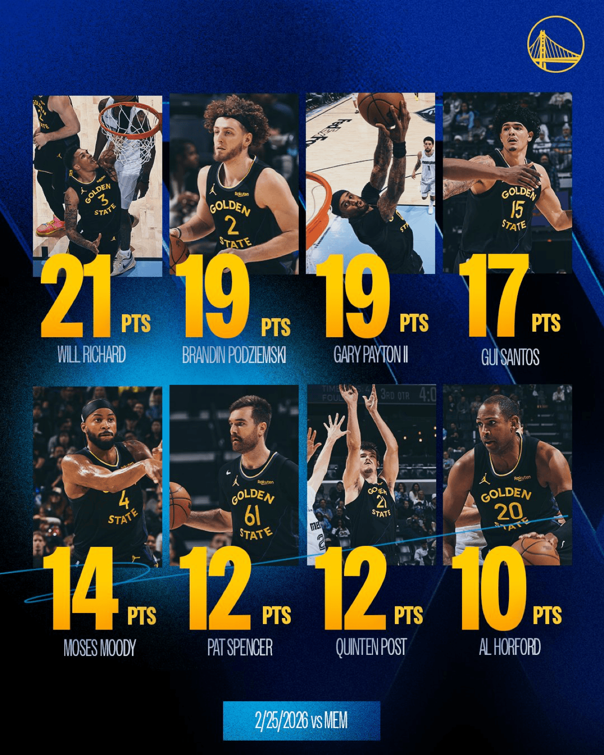 团队篮球!勇士官媒晒众球员得分上双海报:阵容深度尽显!