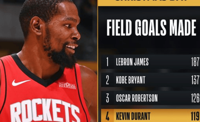 NBA圣诞大战运动战进球排名:杜兰特命中119次,升至第四位
