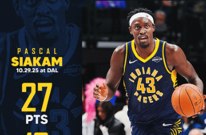 空砍27+13!步行者社媒分享西亚卡姆对阵独行侠的数据海报