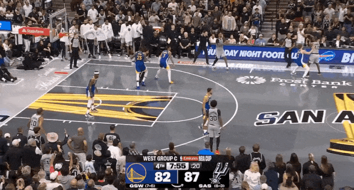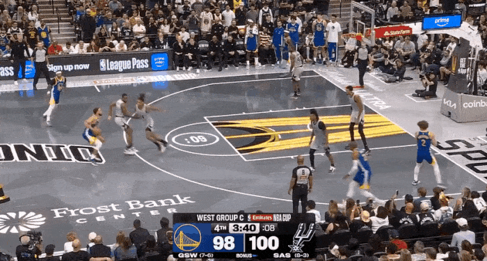 虎扑小佩顿大空位接球三分稳稳命中,勇士一波9-0反超马刺1分