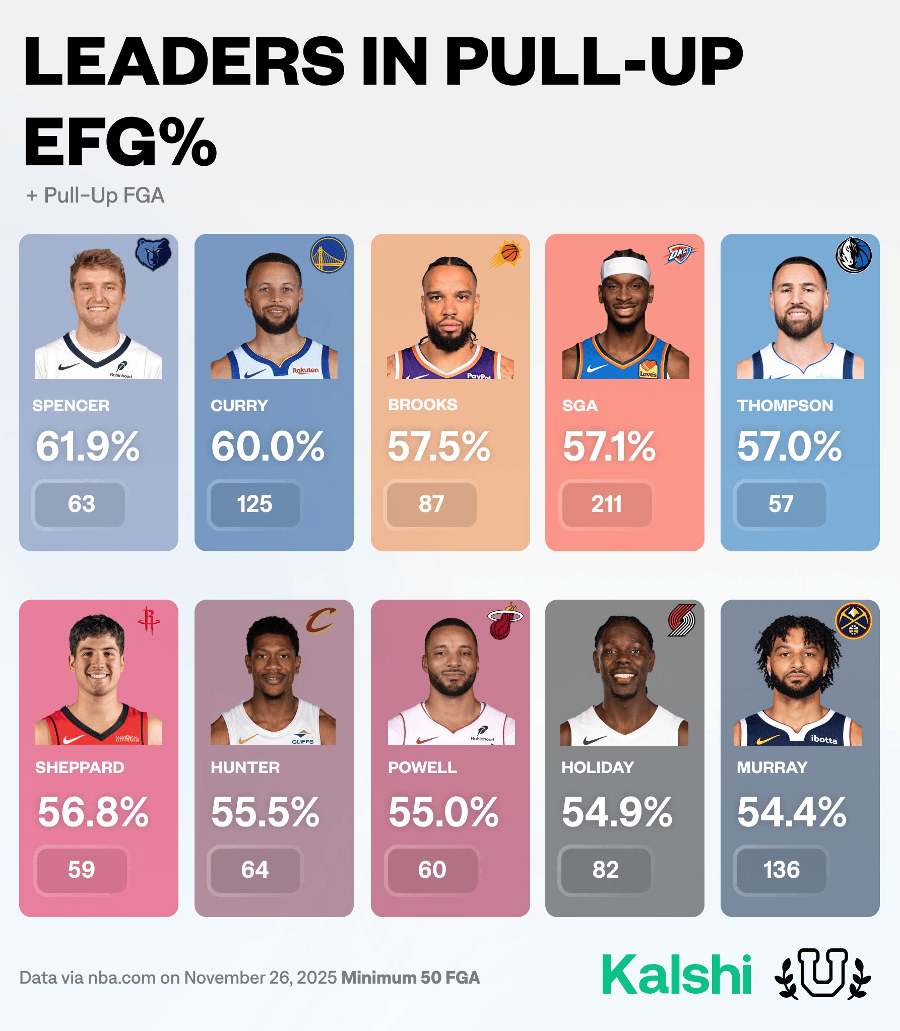 本赛季干拔跳投命中率:斯潘塞第一,库里第二,狄龙第三