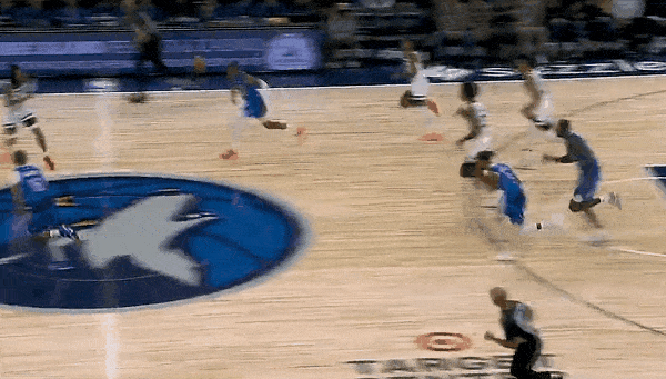 森林狼反击,海兰德快速冲框空中对抗后仰抛投打进