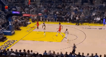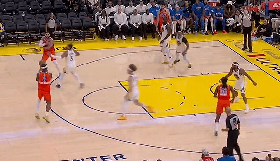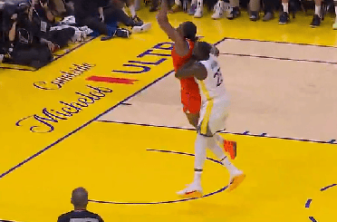 威少底角接球面对杜兰特防守,加速突破被吹踩线出界