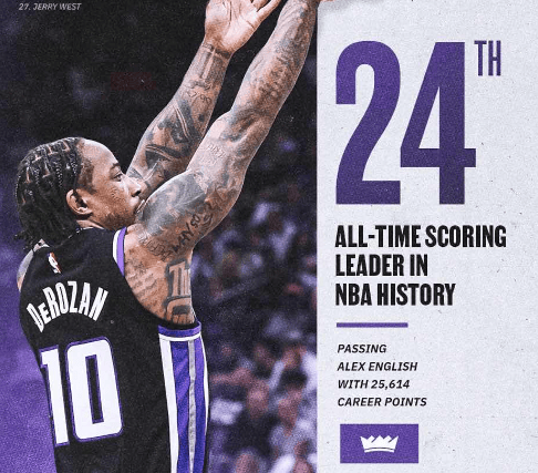 国王社媒分享海报:恭喜德罗赞升至NBA历史总得分榜第24位