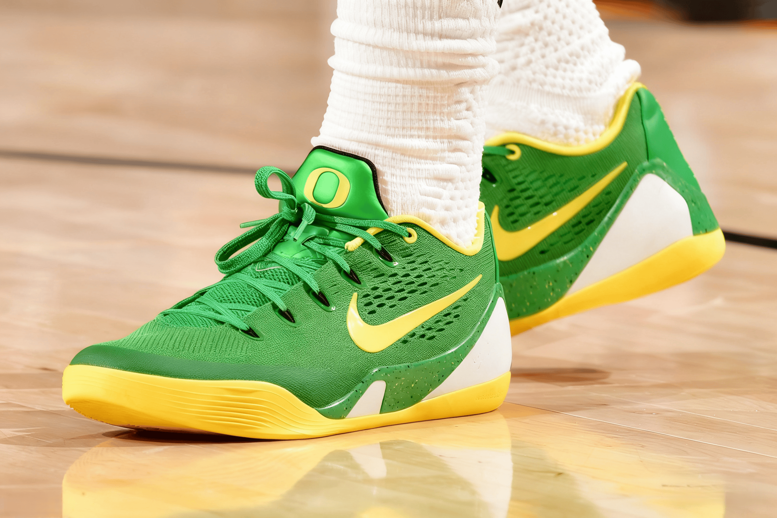 狄龙穿着俄勒冈大学配色科比9EM低帮,得到33分2篮板2助攻