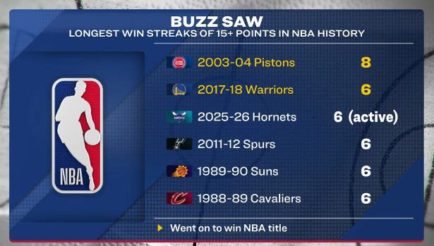 连续赢15+场次纪录:04活塞8场、18勇士6场、本赛季黄蜂6场