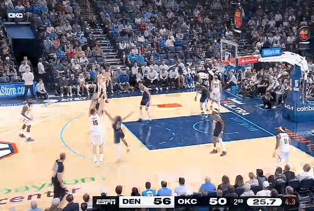 虎扑约基奇三分投进得到11分9篮板4助攻,掘金半场59-50领先雷霆