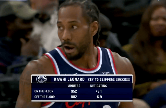 伦纳德在场与否快船净效率值对比:在场时+3.1,不在场-6.9