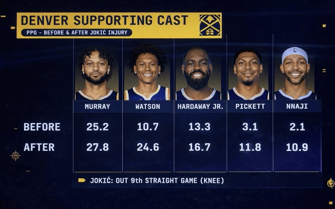 约基奇受伤前后,默里、沃特森等掘金5将场均得分对比