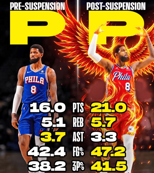 乔治禁赛前场均16分5.1板3.7助,禁赛后场均21分5.7板3.3助